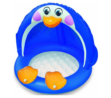 استخر بادی کودک طرح پنگوئن: این محصول یکی از جالب ترین استخرهای بادی برای سنین خردسال و کودکان بوده که از طرح و رنگ کودک پسندانه ای برخوردار است. این محصول از جنس پلاستیک PVC با روکش طرح چرم ضد آب تولید شده که توان مقاومت در برابر شرایط جوی مختلف و انواع آب ها با دمای مختلف را دارد. این کالا با داشتن ابعاد (قطر: 102 سانتی متر، ارتفاع تا بالای سایه بان: 83 سانتی متر) قادر است تا مقدار 45 لیتر آب را در درون خود جای دهد. اما یکی دیگر از مزیت های این استخر کودک داشتن سایه بانی با ضخامت بالا بوده که این امکان را به شما می دهد تا از آن بیرون از منزل یا فضای بسته نیز استفاده نمایید.