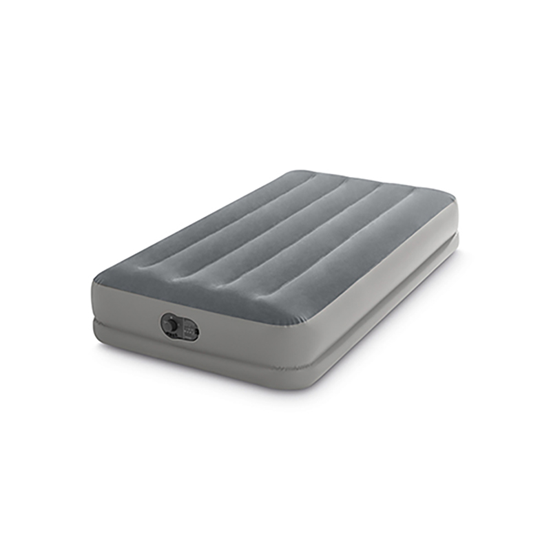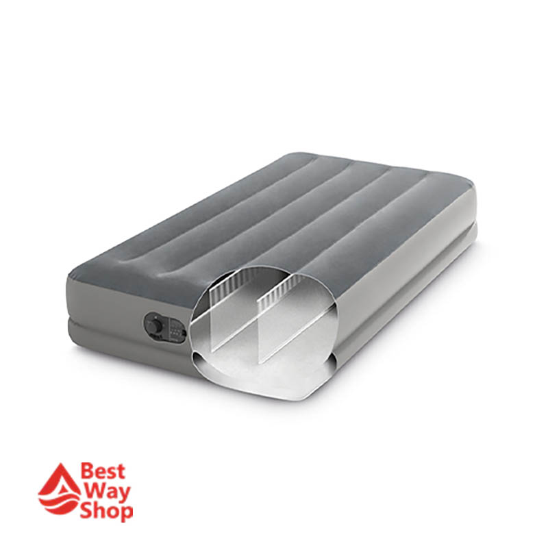 جنس بدنه تخت بادی تک نفره Intex 64112 از PVC فشرده سهلایه تشکیل شده که در برابر فشار، ضربه و رطوبت مقاومت فوقالعادهای دارد. رویه تخت از جیر نرم و ضد حساسیت ساخته شده تا تماس بدن با سطح تخت حس خوشایند و لطیفی ایجاد کند. ساختار داخلی این محصول از نوع سلولی و تقویتشده است که باعث میشود تخت پس از باد شدن، حالت ثابتی پیدا کند و در استفاده طولانیمدت دچار افت ارتفاع نشود. این طراحی هوشمند، حس خواب بر روی تختهای سنتی را شبیهسازی کرده و در عین حال وزن سبک و قابلیت حمل آسان را حفظ کرده است.