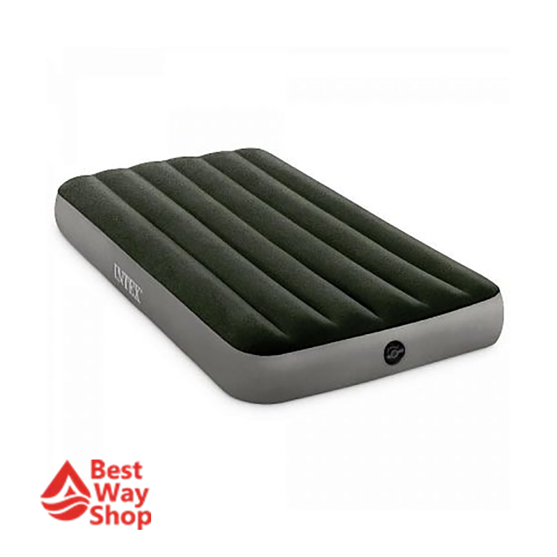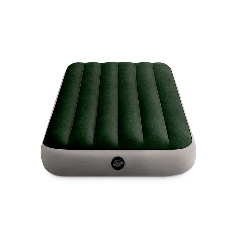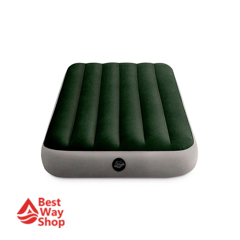 تشک بادی اینتکس مدل 64107 با رنگ سبز تیره و رویه جیر، ظاهری جذاب و مدرن دارد. این ترکیب رنگی به گونهای طراحی شده که با دکوراسیون اتاق یا چادر کمپینگ کاملاً هماهنگ باشد.