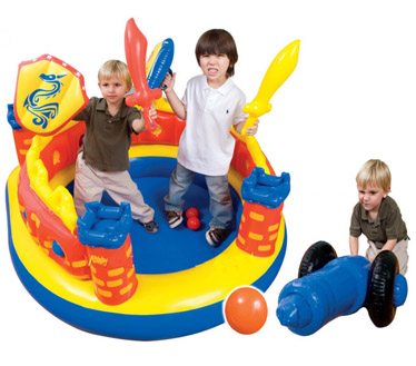 قلعه بادی کودک با شمشیر بادی محصولی شاد و مفرح برای بازی کودکان می باشد که در سال 2013 روانه ی بازراهای جهانی شده است . این محصول توسط برند مطرح اینتکس و با کیفیت فوق العاده ای به بازار عرضه شدکه مورد توجه بسیاری از طرفداران محصولات بادی کودک قرار گرفت . جنس رویه این محصول از پی وی سی می باشد که برای مقاومت بیشتر در برابر فشار و ضربه در قسمت کف این محصول از پی وی سی دو لایه استفاده شده است و این نشان از کیفیت بالای این محصول دارد . ترکیب رنگ این محصول شاد و مفرح می باشد و برای محصولات بادی کودک بسیار جذاب به نظر می رسد که به خوبی می تواند توجه کودک شما را به خود جلب کرده و محیط شادی را برای کودک شما فراهم کند .