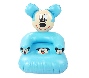 طراحی این مبل بادی به صورت کارتونی می باشد و شخصیت کارتونی میکی موس بر روی آن نقش بسته است . این مبل به صورت چند تکه ساخته شده است که یکی از قسمت های آن را نشیمنگاه نرم و آرگونومیک آن تشکیل داده است . رویه ی این نشیمنگاه به صورت مواج بوده که علاوه بر اینکه بستری نرم را برای کودک به ارمغان آورده است ، به خوبی نیز از تعرق آن ها جلوگیری می کند ، چرا که جریان هوا در بین بدن و روی مبل به خوبی انجام می شود . قسمت دیگر ان را تکیه گاه گرد ان تشکیل داده است که تا امتداد کناره های مبل آمده است و به عنوان دسته می توان از ان استفاده کرد . در بالای این تکیه گاه نیز سر عروسکی میکی موس طراحی شده است که علاوه بر زیبایی منحصر به فرد ، محصول را جذاب کرده است . وجود این سر عروسکی می تواند تکیه گاه مناسبی نیز برای قرار گیری سر کودکان باشد . رنگ این محصول نیلی است که بسیار مورد پسند پسران می باشد . چهره ی میکی موس علاوه بر سر عروسکی، بر روی مبل و دسته ها نیز نقش بسته است .